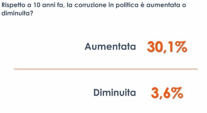 وبحسب رأي غالبية الإيطاليين أيضًا، يعد هذا العنصر متجذر وثابت في السياسة الإيطالية. و يعتقد 56.8% من السكان أنه خلال السنوات العشر الماضية فقط، ظل الفساد في السياسة ثابتًا ومستمرًا عند مستوى عالٍ من الانتشار، في حين يرى ما يقرب من 1 من كل 3 إيطاليين (30.1%) زيادة، وفقاً لوكالة إيطاليا برس للأنباء .