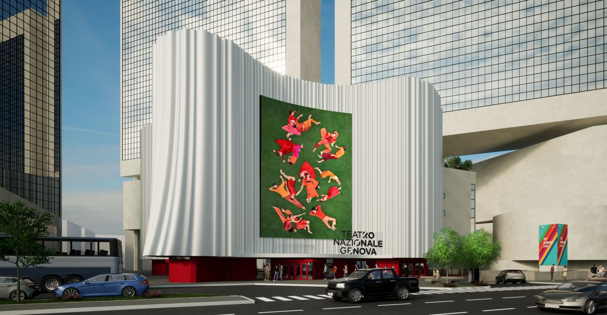 “Il teatro diventa un riflettore, catarifrangente, un’essenza di aggregazione visiva; un oggetto che comunica un’invasione urbana distinguibile dal contesto”, commenta il direttore del Teatro Nazionale di Genova Davide Livermore. L’intervento di warping (rivestimento) della facciata, progettato dallo studio Giò Forma, trasforma il teatro in un’architettura autonoma sempre rispettosa del contesto ma con un suo linguaggio originale: un oggetto che comunica teatro, aggregazione e celebrazione. Lo scopo principale è di conferire dignità e autonomia a un luogo che produce contenuti meravigliosi. La forma del sipario è la crasi dei tre linguaggi principali del progetto: il Teatro (il sipario della scena teatrale), Genova (le tele nautiche) e Ivo Chiesa (onorare il fondatore attraverso un parallelismo con la sua rivista storica Sipario). La nuova facciata farà diventare il Teatro un’architettura indipendente sempre rispettosa del contesto di Corte Lambruschini, caratterizzato da una moltitudine di forme geometriche complesse.