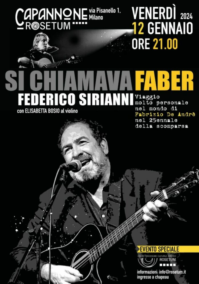 MILANO (ITALPRESS) – Il 12 gennaio, alle ore 21.00, al Centro Culturale Francescano Rosetum, via Pisanello 1, Milano, il cantautore genovese, Federico Sirianni, omaggerà l’amico Fabrizio De Andrè, con un recital per ricordare i 25 anni dalla scomparsa (11 gennaio 1999). Il cantautore Federico Sirianni, pluripremiato, ha avuto l’opportunità di conoscere De Andrè e di incontrarlo nel proprio cammino di vita, esperienziale e musicale. Incontri fugaci, ma di una potenza inaudita, sufficienti a delineare in maniera quasi inequivocabile, per un giovane in procinto di cimentarsi nel mestiere del cantautore, la grandezza umana e artistica del più straordinario scrittore di canzoni del Novecento italiano. In questo recital, Sirianni, racconta aneddoti inediti su Faber, vissuti in prima persona, cerca di penetrare nei sottotesti di una storia ormai molto conosciuta da tutti in un viaggio che parte da Genova, perchè non si può partire che da lì… Sul palco del Capannone Rosetum ci saranno le canzoni di De Andrè, non necessariamente le più famose, ma quelle che riescono forse a esprimere, oltre che l’ormai noto talento, anche la gigantesca umanità di cui era pervaso questo artista unico e irraggiungibile. Sul palco di Rosetum, oltre alla presenza di Sirianni, ci sarà anche Elisabetta Bosio, nota violinista torinese.(ITALPRESS).