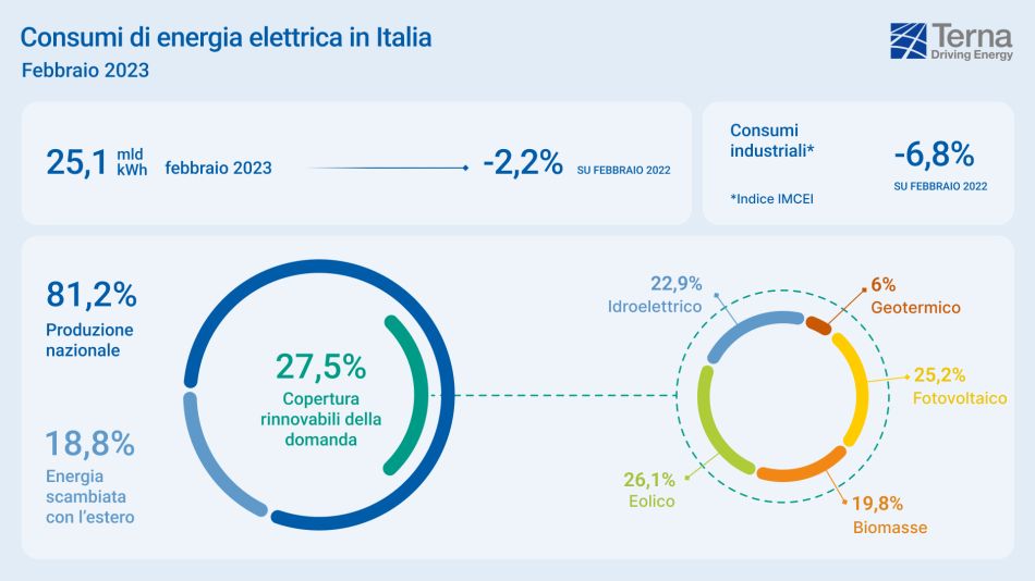 Per quanto riguarda il saldo import-export, la variazione è pari a +33,3% per l’effetto combinato di una diminuzione dell’export (-40,6%) e di un aumento dell’import (+25,9%). L’indice IMCEI elaborato da Terna, che prende in esame i consumi industriali delle imprese cosiddette ‘energivorè, risulta in diminuzione del 6,8% rispetto a febbraio 2022, ma con dati destagionalizzati e corretti dall’effetto calendario registra una crescita del 4,7% rispetto a gennaio. In particolare, rispetto allo stesso mese dello scorso anno, hanno registrato un aumento i consumi dei settori dei mezzi di trasporto, delle ceramiche e delle alimentari.