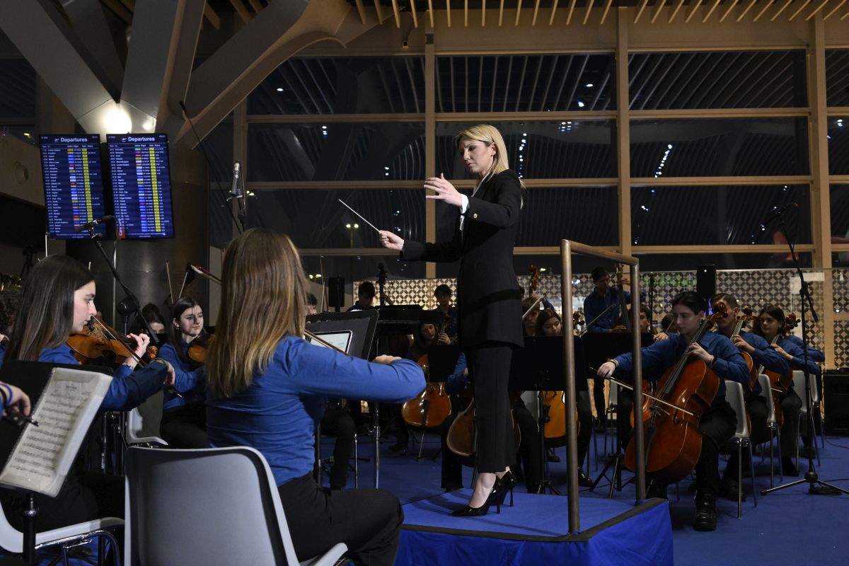 ROMA (ITALPRESS) – Esibizione straordinaria all’aeroporto di Fiumicino della JuniOrchestra dell’Accademia Nazionale di Santa Cecilia di Roma, composta da 111 ragazzi e diretta dalla Maestra Vanessa Benelli Mosell, testimonial della campagna di comunicazione per il lancio di Mundys, la nuova realtà infrastrutturale azionista di riferimento di Adr.