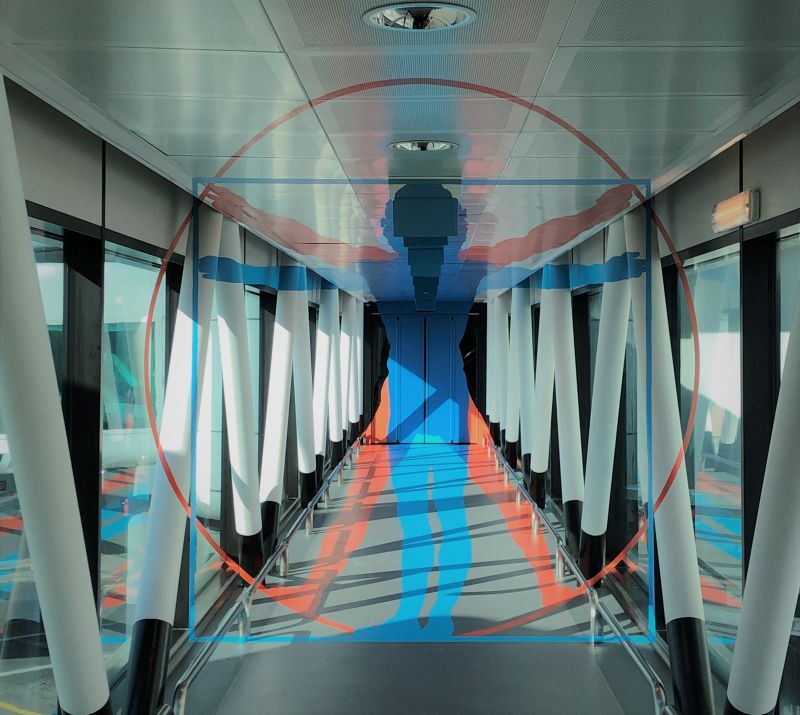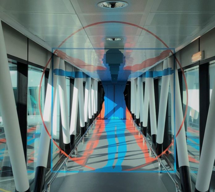 Lo scalo di Fiumicino è il primo aeroporto a inaugurare un’originale serie di installazioni anamorfiche, la particolare tecnica che attraverso un effetto ottico permette di visualizzare oggetti tridimensionali che in realtà non esistono. Le opere, realizzate in collaborazione con il collettivo Truly Urban Artists, sono distribuite tra l’Area di Imbarco Internazionale E e uno dei Loading Bridge dal quale sbarcano i passeggeri internazionali. In questo modo, si possono realizzare scatti fotografici unici da condividere sui social media. La prima opera installata è ispirata all’Uomo di Vitruvio di Leonardo per omaggiare in maniera innovativa il cinquecentenario della morte del genio vinciano. All’interno del Loading Bridge E31, i passeggeri in arrivo, attraverso un’illusione prospettica e grazie a un sapiente gioco di colori, vedranno il disegno ispirato a Leonardo proiettato su diverse superfici, comporsi perfettamente non appena entreranno nel corridoio al termine del loading bridge.