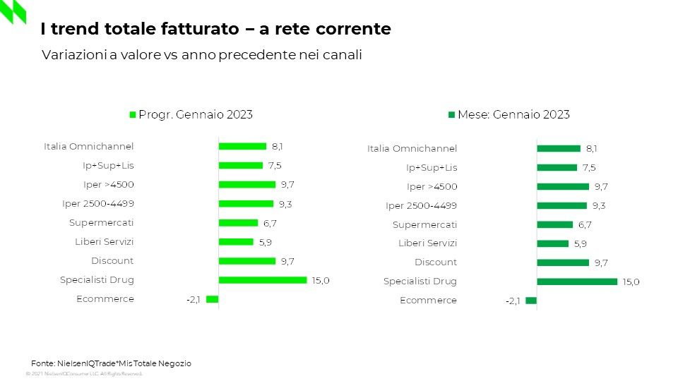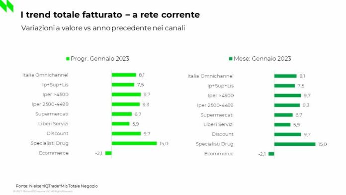 Stando ai dati di NielsenIQ, a gennaio 2023 crescono – rispetto allo stesso periodo dell’anno scorso – tutti i format distributivi e nello specifico gli Specialisti Casa & Persona (+15%), i Discount e gli Iper>4.500mq (+9,7%), seguiti dai Superstore (+9,3%), dai Supermercati (+6,7%) e dai Liberi Servizi (+5,9%).