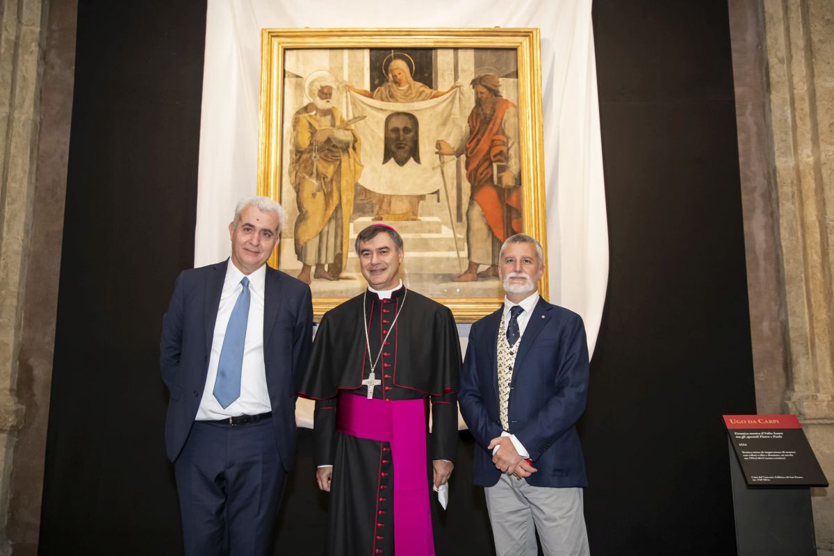 L’opera viene esposta al vasto pubblico grazie al sostegno di Reale Mutua e al contributo tecnico di Targetti Sankey Spa attraverso tecnologie illuminotecniche ad accensione diversificata per una narrazione visiva abbinata. I visitatori potranno ammirare la pala d’altare di Ugo da Carpi con la Veronica che dispiega il velo del Volto Santo tra gli Apostoli Pietro e Paolo – un’opera di straordinaria importanza per arte e fede. Si tratta di una tavola “fatta senza pennello”, come è scritto dall’autore accanto alla firma e come riferisce Giorgio Vasari che la vide in San Pietro insieme a Michelangelo.