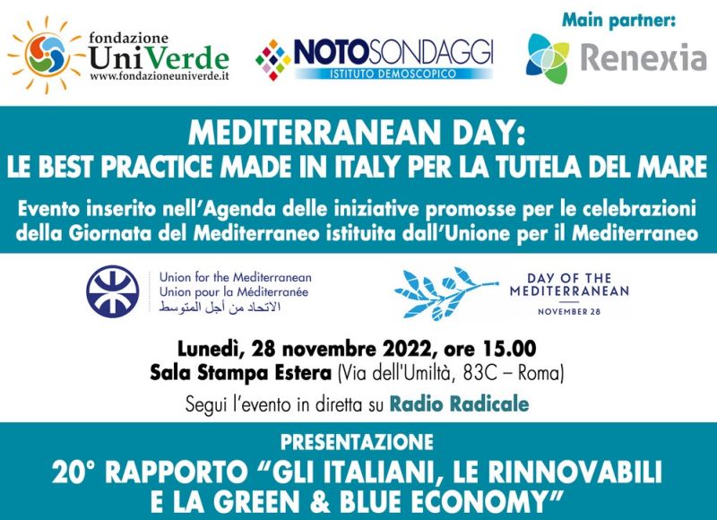 ROMA (ITALPRESS) – Si svolgerà a Roma, lunedì 28 novembre, alle ore 15, presso la Sala della Stampa Estera (via dell’Umiltà, 83C), il convegno di presentazione del 20° Rapporto “Gli italiani, le rinnovabili e la Green & Blue economy” dal titolo “Mediterranean Day: le best practice Made in Italy per la tutela del mare”. L’evento, inserito nell’Agenda delle iniziative promosse per le celebrazioni della Giornata del Mediterraneo istituita dall’Unione per il Mediterraneo, è organizzato da Fondazione UniVerde e Noto Sondaggi con la main partnership di Renexia e sarà trasmesso in diretta streaming su Radio Radicale.