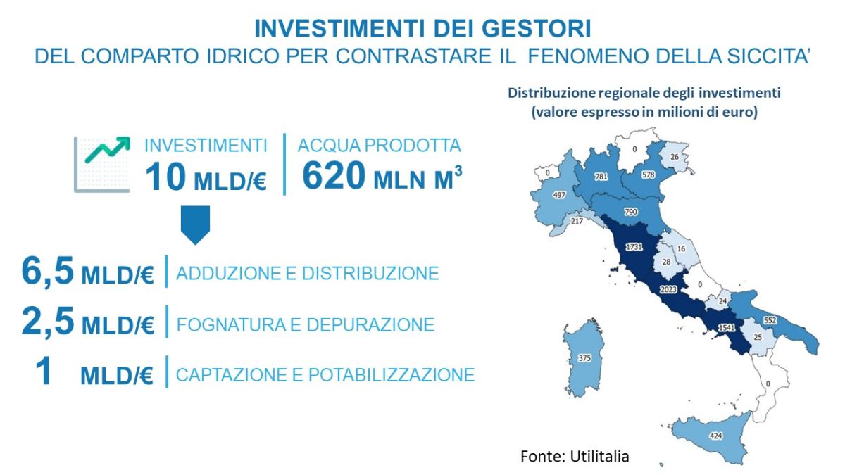 TORINO (ITALPRESS) – Gli effetti dei cambiamenti climatici stanno contribuendo ad alterare l’equilibrio del ciclo idrologico globale, con importanti ripercussioni sulla disponibilità e sulla distribuzione della risorsa idrica. Per garantire nei prossimi anni un approvvigionamento sicuro di acqua potabile, i gestori italiani del servizio idrico investiranno circa 10 miliardi di euro: 3 nel Sud e nelle Isole, 4 al Centro e 3 al Nord; di questi, oltre il 50% (5,2 miliardi) verrà investito già nel triennio 2022-2024. Sono alcuni dei dati che emergono dal paper “Acqua, investimenti e climate change”, realizzato da Utilitalia (la Federazione delle imprese idriche, ambientali ed energetiche) e presentato a Torino in occasione della prima giornata del Festival dell’Acqua, in programma fino al 23 settembre e organizzato in collaborazione con SMAT – Società Metropolitana Acque Torino.