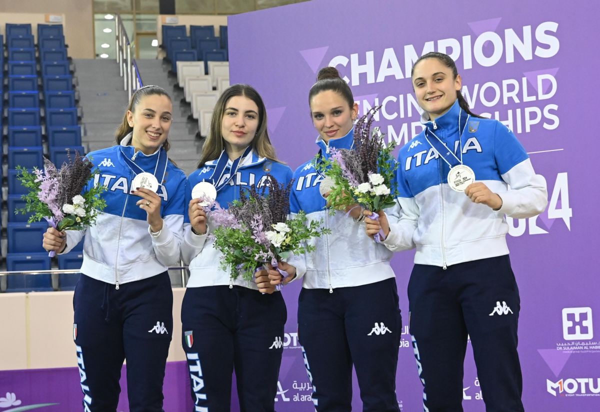 RIYADH (ARABIA SAUDITA) (ITALPRESS) – Nell’ultima giornata dei Mondiali Cadetti e Giovani di Riyadh arrivano altre due medaglie per l’Italia, firmate dalle squadre del ct Nicola Zanotti. E’ argento per il quartetto femminile composto da Manuela Spica, Mariella Viale, Maria Clementina Polli e Alessandra Nicolai, mentre si mette al collo il bronzo la squadra azzurrina maschile con Edoardo Cantini, Francesco Pagano, Edoardo Reale e Marco Stigliano. Si chiude così un’edizione iridata per i Cadetti e Giovani di grandissimo livello per la scherma italiana che, grazie alle 13 medaglie conquistata in Arabia Saudita (2 ori, 5 argenti e 6 bronzi) ha quasi doppiato la spedizione dello scorso anno a Plovdiv (dove i podi furono 7), chiudendo il medagliere per Nazioni 2024 al secondo posto assoluto, vincendo – numericamente – persino più medaglie degli Stati Uniti, Paese leader a livello giovanile. La gara femminile ha visto la formazione composta da Alessandra Nicolai, Maria Clementina Polli, Manuela Spica e Mariella Viale superare con scioltezza nel turno delle 32 le Filippine per 45-11. Negli ottavi di finale l’Italia ha battuto la Gran Bretagna per 45-32 entrando così tra le migliori otto squadre della gara iridata. Grande prestazione anche nei quarti di finale per le ragazze seguite a fondo pedana dal ct Nicola Zanotti e dal referente dell’Under 20 femminile Luigi Miracco con la vittoria sugli Stati Uniti con il punteggio di 45-42. In semifinale, contro l’Uzbekistan, le azzurrine sono state perfette nel rimanere con la testa nel match nonostante il passivo nelle prime frazioni e, grazie ad una rimonta nell’ultimo giro di assalti, sono riuscite a conquistarsi la finalissima imponendosi 45-43. La squadra italiana ha lottato fino all’ultimo anche nel match per l’oro ma ha dovuto arrendersi alla Francia con il punteggio di 45-36 chiudendo comunque con una splendida medaglia d’argento.