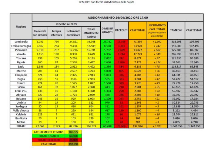 Sono 192.994 le persone che hanno contratto il covid-19 fino a questo momento, con un incremento rispetto a ieri di 3.021 nuovi casi. Il numero totale di attualmente positivi è di 106.527, con un calo di 321 rispetto a ieri: 2.173 sono in cura presso le terapie intensive, 94 pazienti in meno rispetto a ieri; 22.068 persone sono ricoverate con sintomi, con un calo di 803 pazienti rispetto a ieri.