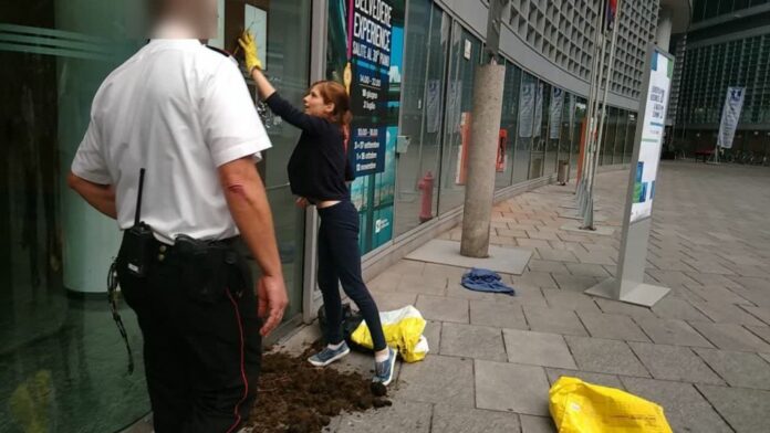 MILANO (ITALPRESS) – Questa mattina, tre attiviste animaliste hanno bloccato, ostacolato e ostruito l’ingresso del Palazzo Lombardia a Milano, sede della giunta regionale, versando del letame all’ingresso e imbrattato le vetrate dell’edificio e stendendo uno striscione con scritto: “Stop sussidi agli allevamenti”. Le attiviste chiedono al Governo Italiano una transizione del sistema alimentare attuale verso uno a base vegetale, alla luce del significativo impatto climatico ed ecologico che ha l’industria zootecnica in Italia e nel mondo.(ITALPRESS).
