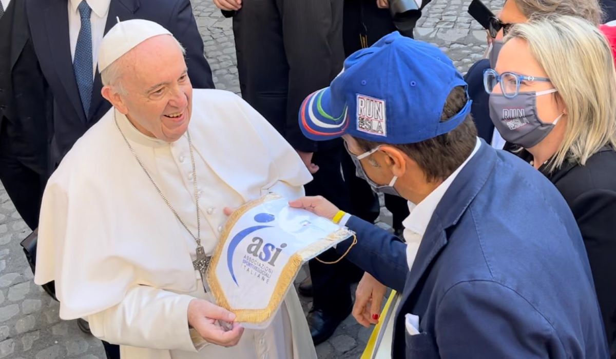 ROMA (ITALPRESS) – “L’ora più buia della notte è quella che precede l’aurora”. Con queste parole il Santo Padre ha accolto la delegazione della Run for SLA in udienza privata in Vaticano. La corsa a tappe quest’anno non si disputerà a causa della pandemia di Covid-19. Una delegazione Asi, patrocinatore e presente anche nel comitato organizzatore della manifestazione, ha donato a Papa Francesco il gagliardetto dell’Ente. “Anche lo sport di base, come tutto il Paese, sta faticosamente uscendo da questa notte buia”, ha così detto, al Santo Padre, Bruno Campanile, vice-presidente di Asi, presente insieme con il consigliere nazionale Davide Magnabosco.