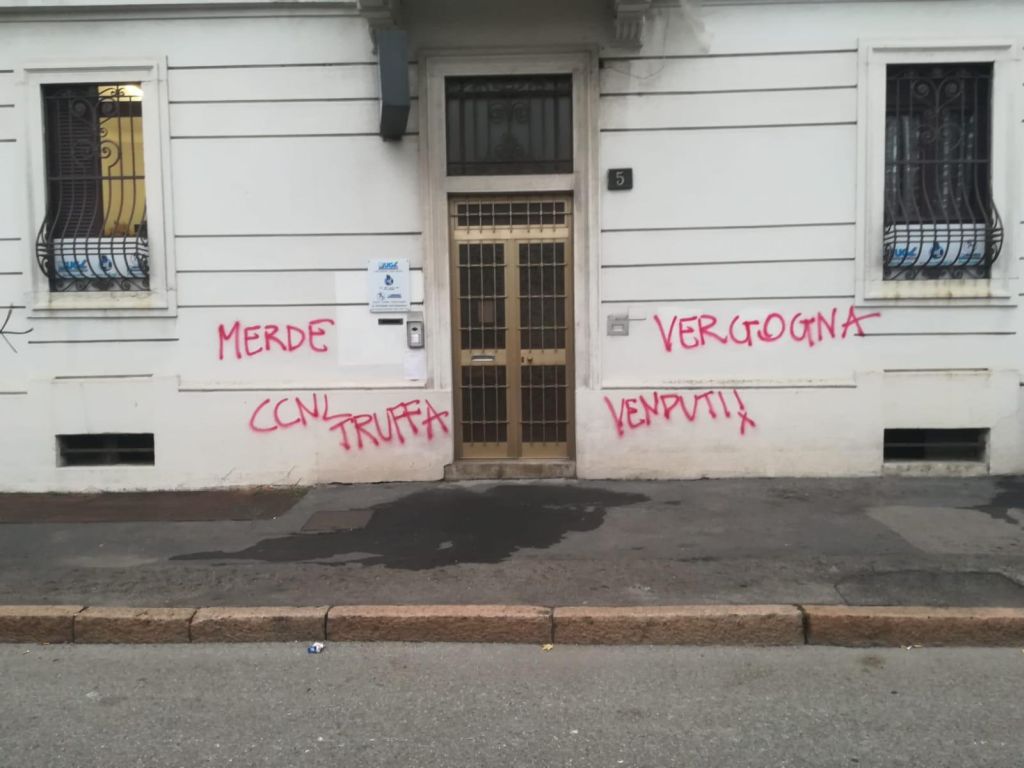 MILANO (ITALPRESS) – Nuovo atto vandalico contro una sede dell’UGL, questa volta a Milano, in via Enrico Annibale Butti, dove nella notte sono state imbrattate le mura del sindacato con scritte offensive riguardo il CCNL Rider.