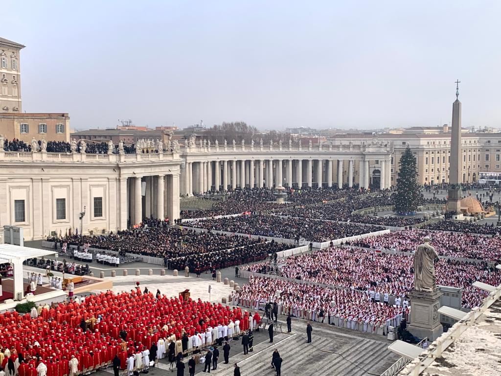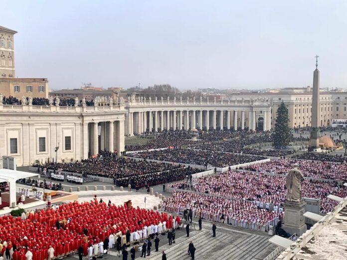 ROMA (ITALPRESS) – Sono in migliaia a Roma, in piazza San Pietro, per i funerali di Benedetto XVI. A presiedere la messa Papa Francesco che però ha lasciato celebrare il decano del collegio cardinalizio, Giovanni Battista Re. Al termine dei funerali, “solenni ma sobri”, la salma del Papa emerito lascerà la piazza per raggiungere le grotte vaticane dove sarà tumulata durante una cerimonia privata. A concelebrare i funerali del papa emerito 130 cardinali, 300 vescovi e 3700 sacerdoti arrivati a Roma da tutto il mondo. I fedeli presenti seguono la celebrazione sui libretti distribuiti in piazza, con il testo della messa