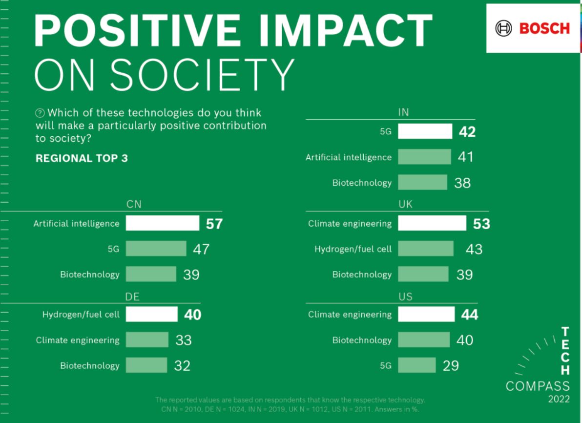 STOCCARDA (ITALPRESS) – La stragrande maggioranza delle persone intervistate in tutto il mondo crede che il progresso tecnologico stia migliorando il nostro pianeta (72%). È il risultato del Bosch Tech Compass, un sondaggio rappresentativo dell’opinione pubblica in Cina, India, Germania, Regno Unito e Stati Uniti. Il sondaggio è stato presentato in anteprima al CES 2022. In considerazione dei rapidi e profondi cambiamenti a cui la tecnologia sta portando in molti ambiti della vita, Bosch Tech Compass punta a incoraggiare le persone a osservare più da vicino l’impatto positivo del progresso tecnologico nel mondo globalizzato in cui viviamo.