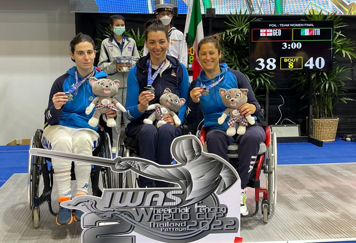 ROMA (ITALPRESS) – Nell’ultima giornata della Coppa del Mondo di scherma paralimpica in Thailandia l’Italia sale sul podio in tutte e tre le gare a squadre in programma. Dopo i quattro podi individuali (l’argento di Emanuele Lambertini nella spada categoria A e i bronzi di Andreea Mogos nel fioretto categoria A, Gianmarco Paolucci nella sciabola categoria B ed Edoardo Giordan nella sciabola categoria A), gli azzurri sono riusciti a piazzarsi al secondo posto nel fioretto femminile a squadre e nella prova mista di spada e al terzo nella sciabola maschile a squadre.