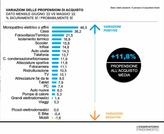 “La percentuale del campione che ritiene che i prezzi siano “molto in crescita – commenta Claudio Bardazzi, responsabile Osservatorio Findomestic – è la più elevata degli ultimi dodici mesi (65%). Allo stesso tempo si registrano le percentuali più basse (27%) di quanti percepiscono nell’immediato l’opportunità di fare acquisti. Se questi due aspetti non favoriscono nel contesto attuale l’andamento dei consumi, c’è sempre una metà del campione (47%) che guarda al futuro con ottimismo e questo ottimismo si riflette nelle intenzioni d’acquisto a tre mesi”. Gli italiani ritrovano la voglia di acquistare casa (+36,2% rispetto a maggio) o di ristrutturarla (+10,5%) per renderla sempre più efficiente e sostenibile: la propensione all’acquisto è salita nell’ultimo mese del 21,5% per gli impianti fotovoltaici termici e del 16,9% per l’isolamento termico. Bene anche infissi (+14,8%), caldaie a condensazione/biomassa (+11,9%) e pompe di calore (+5,3%). Torna a crescere sensibilmente l’interesse per le TV (+10,1%), lievemente per gli elettrodomestici grandi (+1,4%). Stabili rispetto al mese precedente le intenzioni di acquistare elettrodomestici piccoli, lievissima flessione per i mobili (-1,6%) che rimangono comunque su livelli molto elevati.