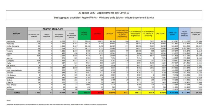 MILANO (ITALPRESS) – Sono 1.411 i nuovi positivi al Coronavirus nelle ultime 24 ore. Una cinquantina in più rispetto alla giornata di ieri quando l’aumento era stato di 1.367 casi. Il totale delle persone attualmente contagiate è di 21.932, circa 1.200 più di ieri. E’ quanto emerge dal quotidiano Bollettino del Ministero della Salute e della Protezione Civile. I casi totali registrati da inizio pandemia passano quindi a 263.949. Il numero di decessi nelle ultime 24 ore sale di 5, arrivando ad un totale di 35.463. Le persone attualmente ricoverate con sintomi sono 1.131 (76 in più di ieri), dei quali 69 sono in terapia intensiva (due in meno di ieri) e 20.734 in isolamento domiciliare. I tamponi effettuati nelle ultime 24 ore sono 94.024, circa 500 in più di ieri. Un solo nuovo caso di Covid nelle ultime 24 ore in Valle D’Aosta e Molise, mentre la regione che fa registrare il maggior numero di nuovi casi è la Lombardia con 286, seguita dall’Emilia Romagna con 171 e dal Lazio 152.