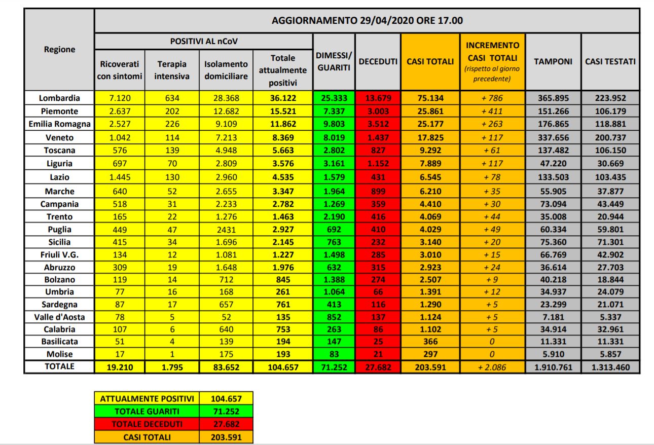 Il totale delle persone che a oggi hanno contratto il virus è 203.591, con un incremento rispetto a ieri di 2.086 nuovi casi. Il numero totale di attualmente positivi è di 104.657, con una decrescita di 548 assistiti rispetto a ieri.