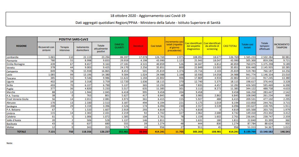 Il totale dei dimessi/guariti, ad oggi, è di 251.461 (+2.334), mentre gli attuali positivi sono 118.356 (+1.421). Ad oggi sono 7.131 (+514) i ricoverati con sintomi, 750 (+45) si trovano in terapia intensiva, mentre in isolamento domiciliare ci sono 118.356 persone. La Lombardia si conferma la regione dove, nelle ultime 24 ore, è stato registrato il maggior numero di nuovi casi (2.975), seguita da Campania (1.376) e Lazio (1.198).