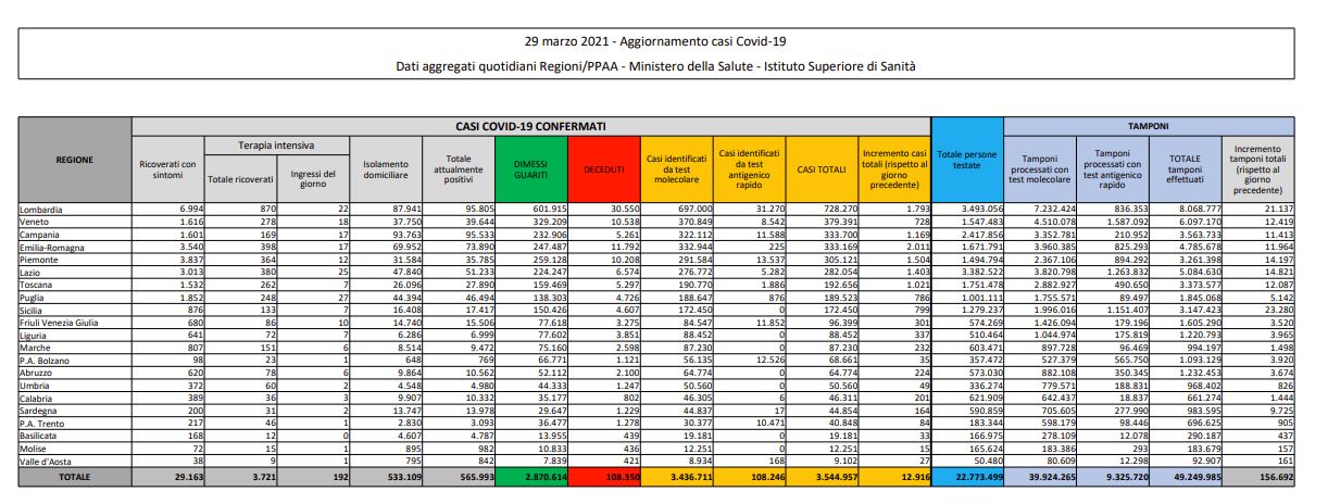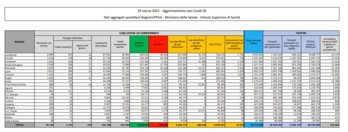 I guariti sono 19.725 e gli attuali positivi scendono a 565.993 (7.242 in meno rispetto a ieri). I ricoverati nei reparti ordinari sono 29.163, 462 in più rispetto a ieri. Le terapie intensive sono a 3.721 ricoverati (+42 unità) con 192 nuovi ingressi. In isolamento domiciliare sono 533.109 persone. La regione con il maggior numero di casi è l’Emilia-Romagna (2.011), seguita da Lombardia (1.793), e Piemonte (1.504).