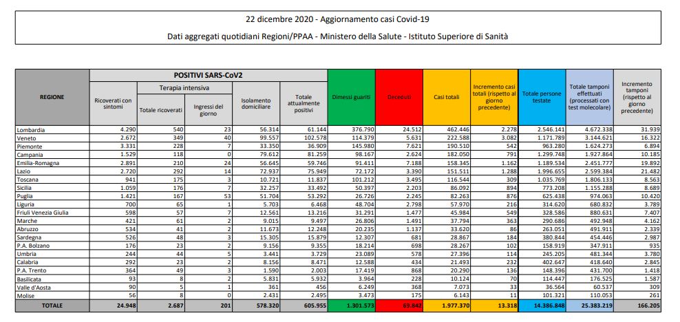 Prosegue intanto il calo dei ricoveri, sono 197 in meno e questo porta il dato complessivo a 24.948, di questi 2.687 si trovano in terapia intensiva, con un saldo negativo di 44, anche se si registrano 201 nuovi ingressi. Infine sono 585.706 le persone in isolamento. Per quanto riguarda il dato su singole regioni, la più colpita- almeno sul fronte dei nuovi contagi- si conferma il Veneto (3.082), seguita da Lombardia (2.278) e da Emilia-Romagna (1.662).