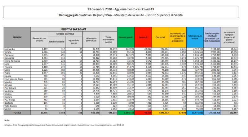ROMA (ITALPRESS) – Sono 17.938 i nuovi casi di Coronavirus, secondo i dati del Ministero della Salute, a fronte di 152.697 tamponi effettuati. I decessi, invece, sono 484 per un totale di 64.520 vittime da inizio emergenza. Con quelle di oggi diventano 1.843.712 le persone che hanno contratto il Covid da inizio pandemia, e 24.215.726 i tamponi complessivi effettuati. Attualmente i positivi in Italia sono 686.031 mentre sono 655.138 le persone in isolamento domiciliare. I ricoverati in ospedale con sintomi sono 27.735 di cui 3.158 in terapia intensiva. I dimessi/guariti sono 1.093.161, con un incremento di 16.270 unità nelle ultime 24 ore. La regione con il maggior numero di nuovi casi è il Veneto (4.902), seguita da Lombardia (2.335), Emilia Romagna (1.940), Lazio (1.339) e Campania (1.219).