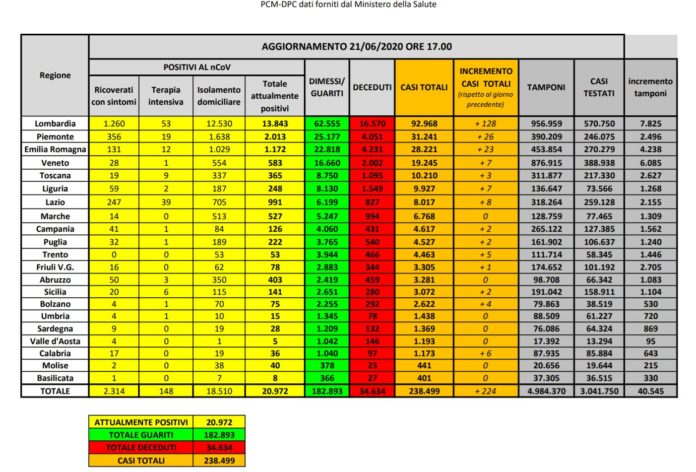 Il totale delle persone che hanno contratto il virus è di 238.499, con un incremento rispetto a ieri di 224 nuovi casi.