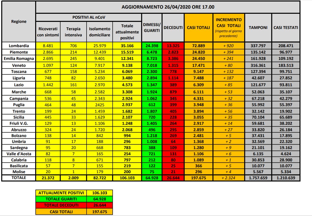 Rispetto a ieri i deceduti sono 260 e portano il totale a 26.644. Il numero complessivo dei dimessi e guariti sale invece a 64.928, con un incremento di 1.808 persone rispetto a ieri.