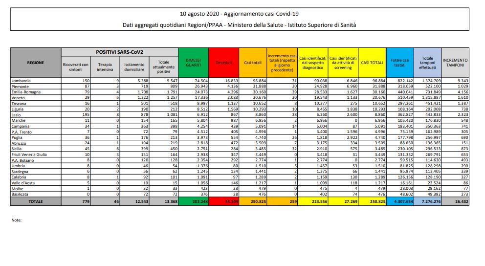 ROMA (ITALPRESS) – Sono 259 i nuovi casi di Coronavirus registrati nelle ultime 24 ore, in sensibile discesa rispetto a ieri, quando i nuovi contagi erano stati 463. Le regioni dove è stato rilevato il numero maggiore di nuovi casi sono Emilia Romagna (39), Lazio (38), Sicilia (32) e Lombardia (31). Nessun caso registrato in Friuli Venezia Giulia, Molise e Basilicata. 4 le persone decedute (ieri erano state 2), con il totale che arriva a 35.209. Gli attualmente positivi sono 13.368, mentre il totale dei contagiati dall’inizio della pandemia raggiunge quota 250.825. Sono 779 i ricoverati con sintomi, di questi 46 (+4 rispetto a ieri) si trovano attualmente nelle terapie intensive. Il totale dei dimessi/guariti è di 202.248, mentre in isolamento domiciliare si trovano 12.543 persone.