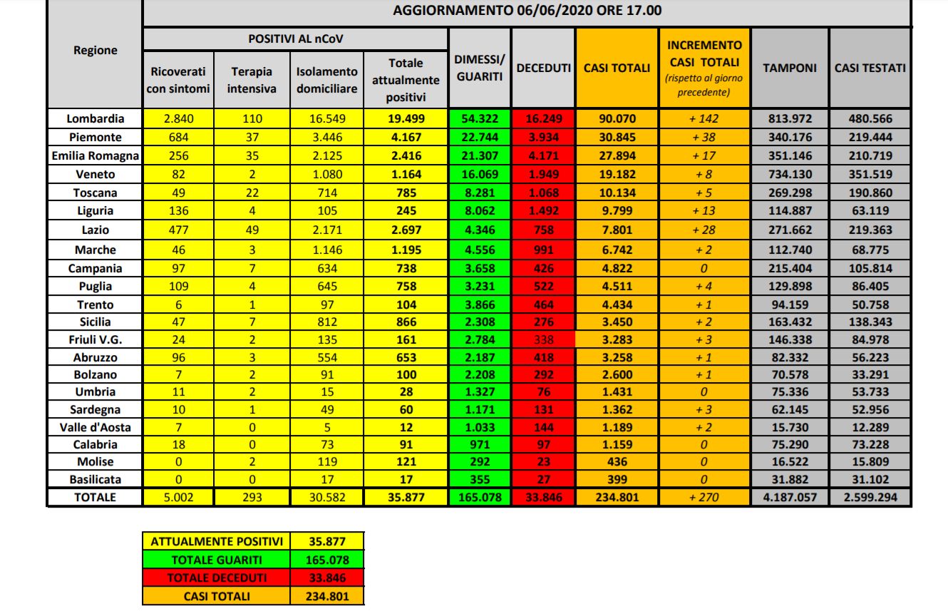 ROMA (ITALPRESS) – A oggi, 6 giugno, il totale delle persone che hanno contratto il virus è di 234.801, con un incremento rispetto a ieri di 270 nuovi casi.