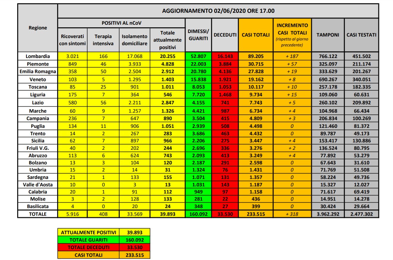 ROMA (ITALPRESS) – A oggi, 2 giugno, il totale delle persone che hanno contratto il virus è di 233.515, con un incremento rispetto a ieri di 318 nuovi casi.