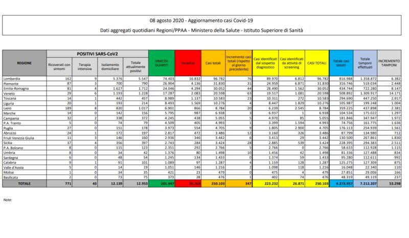 All’8 agosto, il totale delle persone che hanno contratto il coronavirus che causa il Covid-19 è di 250.103, con un incremento rispetto al 7 agosto di 347 nuovi casi. Lo rende noto il ministero della Salute. Il numero totale di attualmente positivi è di 12.953, con un incremento di 29 assistiti rispetto al 7 agosto. Tra gli attualmente positivi, sono 43 (+1) in cura presso le terapie intensive, 771 persone sono ricoverate con sintomi, con un decremento di 8 pazienti rispetto al 7 agosto. 12.139 persone sono in isolamento senza sintomi o con sintomi lievi. Rispetto al giorno precedente i nuovi deceduti sono 13 e portano il totale a 35.203. Il numero complessivo dei dimessi e guariti sale invece a 201.947, con un incremento di 305 persone rispetto al 7 agosto. Il numero di tamponi effettuati nelle ultime ventiquattro ore ammonta a 53.298, per un totale di 7.212.207.