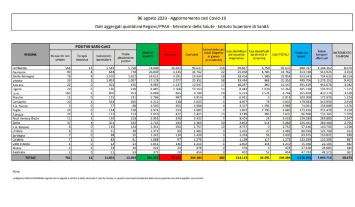 ROMA (ITALPRESS) – Aumento dei contagi in Italia. I nuovi positivi nelle ultime 24 ore sono 402, 18 in più rispetto a ieri. Un numero che porta a 249.204 il totale dei contagiati dall’inizio della pandemia. Diminuiscono i decessi, 6 contro i 10 registrati ieri. Lo riporta il bollettino quotidiano del Ministero della Salute.