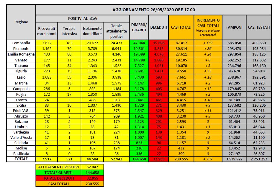 Al 26 maggio il totale delle persone che hanno contratto in Italia il coronavirus che causa il Covid-19 è di 230.555, con un incremento rispetto al 25 maggio di 397 nuovi casi.