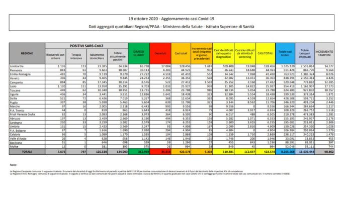MILANO (ITALPRESS) – Sono 9.338 i nuovi casi di Coronavirus in Italia, quasi duemila meno di ieri quando furono 11.705. Un calo dovuto in parte alla diminuzione del numero di persone tamponate, che nelle ultime 24 ore sono state 98.862, contro le 146.541 del giorno precedente. E’ quanto emerge dal quotidiano bollettino del Ministero della Salute appena pubblicato. Sono 73, invece, le vittime dell’ultima giornata (in aumento rispetto a ieri, quando furono 69) con il totale dei decessi dall’inizio della pandemia che sale a quota 36.616. Nelle ultime 24 ore i pazienti guariti sono stati 1.498. Il totale dei positivi attuali è pari a 134.003, dei quali 125.530 in isolamento domiciliare. I ricoverati in ospedale con sintomi sono 7.676, circa 500 in più di ieri. Sono invece 797 i pazienti ricoverati in terapia intensiva, 47 in più di ieri. A livello regionale, resta quello lombardo, il territorio più problematico, con 1.687 nuovi casi, seguito dalla Campania con 1.593. Tutte sotto i mille invece le altre regioni. La Basilicata, con 22 nuovi casi è la regione meno colpita. Per quanto riguarda gli ospedali, quelli più affollati sono quelli lombardi con 1.136 ricoverati, seguiti da quelli laziali con 1.130. Lombardia e Lazio sono anche le uniche regioni com più di cento ricoveri nelle terapie intensive (113 la Lombardia, 111 il Lazio). Non ci sono ricoverati gravi, invece in Molise.