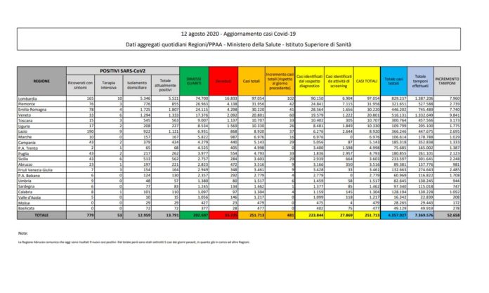 ROMA (ITALPRESS) – Continua l’incremento giornaliero di contagi da coronavirus in Italia. Nelle ultime 24 ore, secondo il bollettino del ministero della Salute, i nuovi casi sono stati 481, in aumento rispetto ai 412 di ieri. Il totale dei positivi dall’inizio della pandemia tocca quota 251.713. Impennata dei nuovi casi in Lombardia (102), seguita da Veneto (60), Piemonte (42). Nessun nuovo caso nella provincia autonoma di Trento, Valle d’Aosta, Molise e Basilicata. In aumento anche le persone decedute, 10 (+4 rispetto a ieri). Gli attualmente positivi sono 13.791 (+230). Calano i ricoverati con sintomi: sono 779, 22 in meno rispetto a ieri. In aumento invece i ricoverati nelle terapie intensive, sono 53 (+4 rispetto a ieri). Il totale dei dimessi/guariti registra il numero di 202.697 (+236), mentre in isolamento domiciliare si trovano 12.959 persone (+248).