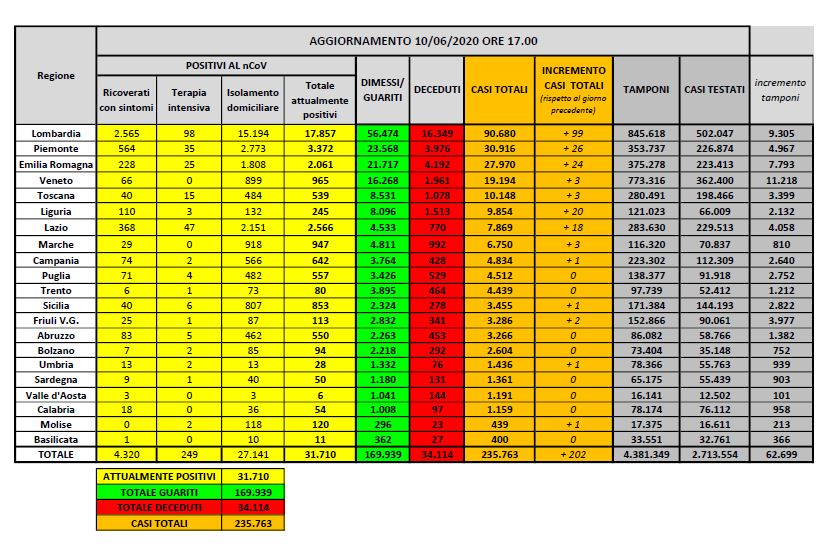 Al 10 giugno il totale delle persone che hanno contratto in Italia il coronavirus che causa il Covid-19 è di 235.763, con un incremento rispetto a ieri di 202 nuovi casi.