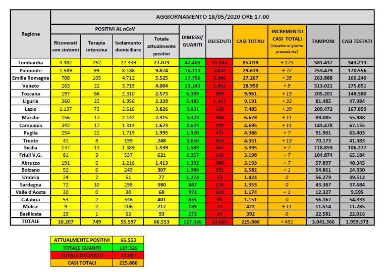 Rispetto al 17 maggio i deceduti sono 99 e portano il totale a 32.007. Il numero complessivo dei dimessi e guariti sale invece a 127.326, con un incremento di 2.150 persone rispetto al 17 maggio.