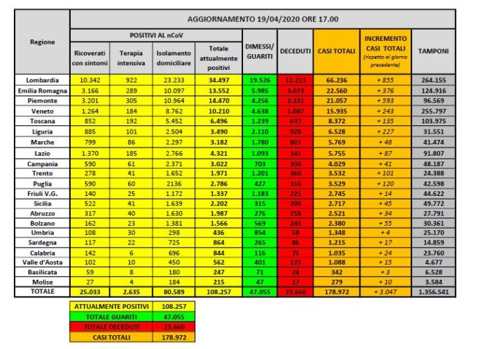 Sono 47.055 le persone guarite, con un aumento di 2.128 unità rispetto a ieri. I deceduti sono 23.660, 433 in più rispetto al dato complessivo alla data di ieri, ma questo numero potrà essere confermato solo dopo che l’Istituto Superiore di Sanità avrà stabilito la causa effettiva del decesso.