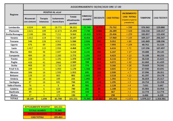 Al 30 aprile il totale delle persone che hanno contratto il coronavirus che causa il Covid-19 è 205.463, con un incremento rispetto a ieri di 1.872 nuovi casi. Il numero totale di attualmente positivi è di 101.551, con una decrescita di 3.106 assistiti rispetto a ieri. Tra gli attualmente positivi 1.694 sono in cura presso le terapie intensive, con una decrescita di 101 pazienti rispetto a ieri. 18.149 persone sono ricoverate con sintomi, con un decremento di 1.061 pazienti rispetto a ieri. 81.708 persone, pari al 80% degli attualmente positivi, sono in isolamento senza sintomi o con sintomi lievi. Rispetto a ieri i deceduti sono 285 e portano il totale a 27.967. Il numero complessivo dei dimessi e guariti sale invece a 75.945, con un incremento di 4.693 persone rispetto a ieri.
