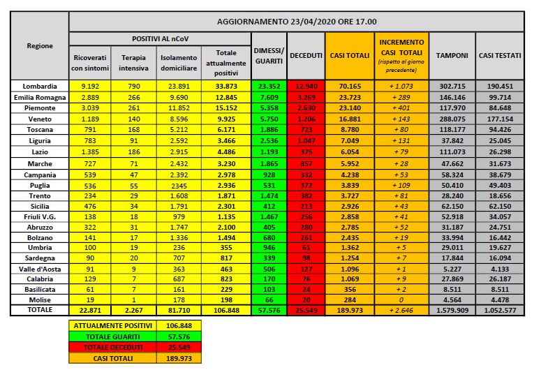 Nel dettaglio, i casi attualmente positivi sono 33.873 in Lombardia, 12.845 in Emilia-Romagna, 15.152 in Piemonte, 9.925 in Veneto, 6.171 in Toscana, 3.466 in Liguria, 3.230 nelle Marche, 4.486 nel Lazio, 2.978 in Campania, 1.871 nella Provincia autonoma di Trento, 2.936 in Puglia, 1.135 in Friuli Venezia Giulia, 2.301 in Sicilia, 2.100 in Abruzzo, 1.494 nella Provincia autonoma di Bolzano, 355 in Umbria, 817 in Sardegna, 823 in Calabria, 463 in Valle d’Aosta, 229 in Basilicata e 198 in Molise.