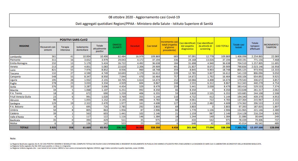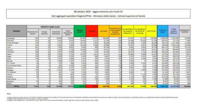 ROMA (ITALPRESS) – Non si ferma l’aumento dei contagi da coronavirus in Italia. I nuovi casi superano quota 4 mila, per l’esattezza nelle ultime 24 ore se ne registrano 4.458. Calano i decessi, che scendono a 22. E’ quanto si evince dalla lettura del bollettino quotidiano del Ministero della Salute. Record di tamponi: 128.098, in aumento rispetto ai 125.312 mila di ieri. Gli attualmente positivi sono 65.992 (+3.376). In crescita i ricoverati con sintomi, oggi sono 3.925 (+143), di questi 358 (+21) si trovano in terapia intensiva. In isolamento domiciliare invece ci sono 61.669 persone. Gli aumenti maggiori di casi in Campania (757), Lombardia (683), Veneto (491). La regione con l’incremento minore è il Molise (6).