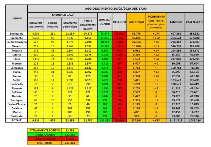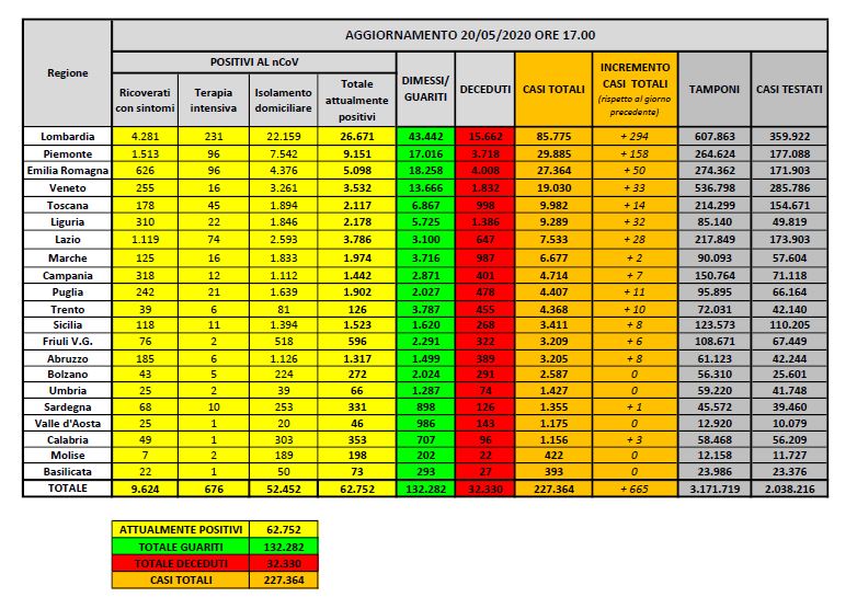 Rispetto al 19 maggio i deceduti sono 161 e portano il totale a 32.330. Il numero complessivo dei dimessi e guariti sale invece a 132.282, con un incremento di 2.881 persone rispetto al 19 maggio.