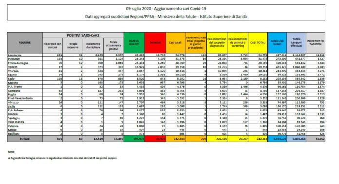 ROMA (ITALPRESS) – Continuano ad aumentare i casi di coronavirus in Italia, dove nelle ultime 24 ore si registrano 229 nuovi positivi (ieri erano 193) dei quali 119 nella sola Lombardia. Ancora in calo i decessi rispetto a ieri: 12 i morti, che portano il numero complessivo a 34.926. Sono questi i numeri del bollettino resi noti oggi dal Ministero della Salute. In totale i contagiati da inizio Covid-19 sono 242.363. Il numero di guariti oggi è in diminuzione a 338, per un totale di 193.978. Cala di 28 il numero di ricoverati (871), mentre si riduce di 2 il numero dei ricoverati nelle terapie intensive, ora sono 69. Il numero delle persone in isolamento domiciliare è di 12.519, con un calo di 106 rispetto a ieri. Nelle ultime 24 ore sono stati effettuati 52.552 tamponi. Sette le regioni italiane che non hanno registrato nuovi positivi oggi: si tratta di Puglia, Umbria, Sardegna, Valle d’Aosta, Calabria, Molise e Basilicata.