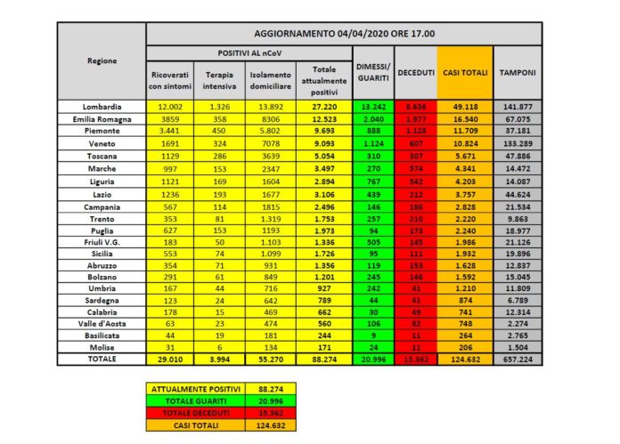 Coronavirus, in Italia 88.274 positivi, 15.362 morti e 20.996 guariti