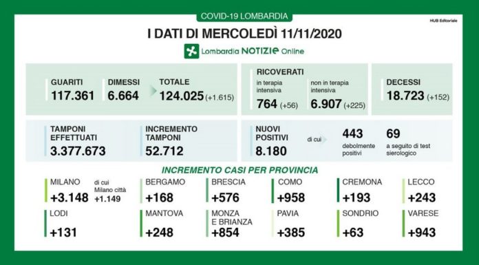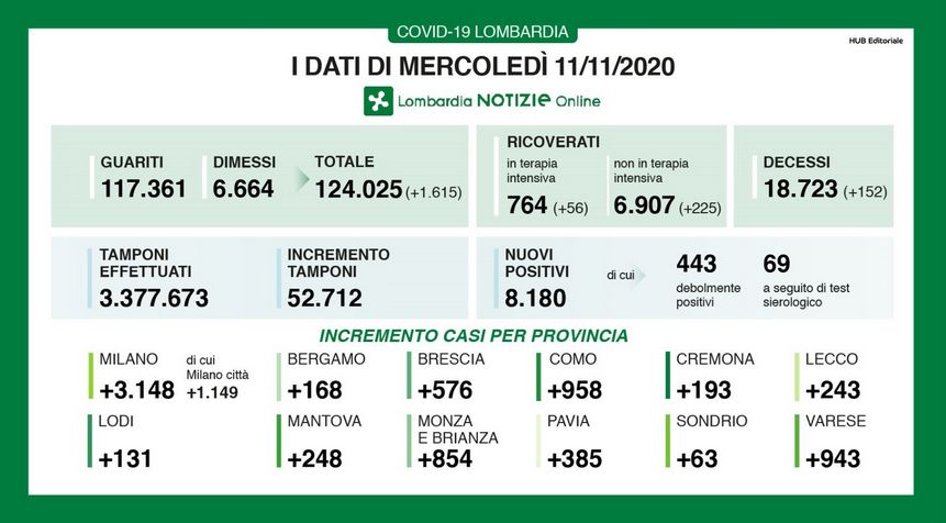 La provincia di Milano resta la più colpita, con 3.148 casi odierni, di cui 1.149 a Milano città. Rispetto a ieri calano i contagiati nella Provincia di Varese, dove ieri erano emersi 3.081 casi, mentre oggi sono 943. Seguono la Provincia di Como con 958 positivi e quella di Monza e Brianza con 854. Per quanto riguarda le altre province lombarde i casi di Covid oggi sono a Brescia +576; Pavia +385; Mantova + 248; Cremona: + 193; Lecco + 243, Bergamo + 168 , Lodi + 131 e Sondrio + 63.