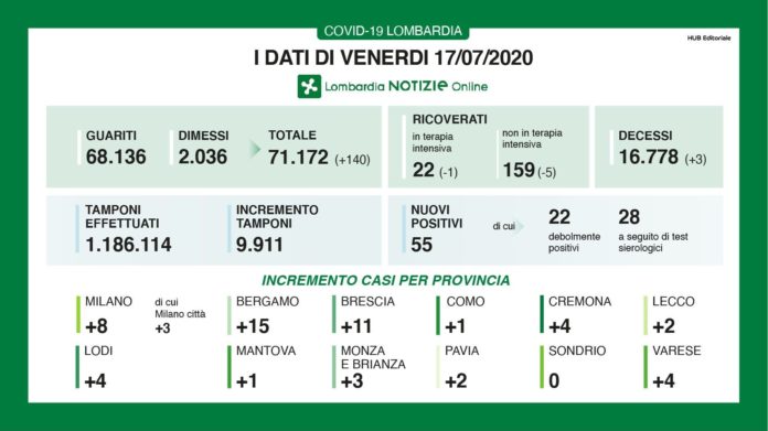 MILANO (ITALPRESS) – I nuovi casi di coronavirus in Lombardia sono oggi 55, in diminuzione rispetto agli 80 di ieri. In calo anche i decessi, oggi 3 contro i 10 di ieri: totale complessivo dall’inizio della pandemia è 16.778. Lo riferisce il consueto bollettino regionale sui dati epidemiologici diffuso da Palazzo Lombardia, precisando che dei 55 positivi, 28 sono emersi a seguito di test sierologici e 22 sono ‘debolmente positivì. Rispetto ai 96 di ieri crescono anche i guariti/dimessi che nelle ultime 24 ore sono 140, per un totale di 71.172, di cui 69.136 guariti e 2.036 dimessi. In discesa i ricoverati in ospedale, con una unità in meno nei reparti di terapia intensiva (totali attuali nella Regione sono 22) e calano di 5 negli altri reparti (totale 159).