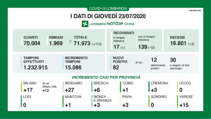 Coronavirus, in Lombardia 82 nuovi casi e 3 decessi