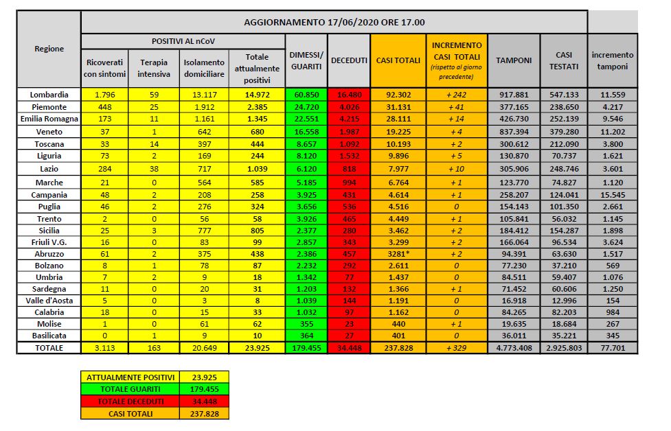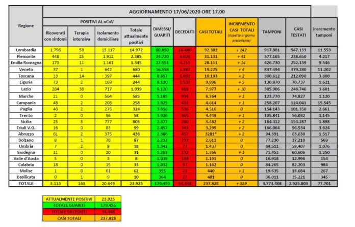 A oggi il totale delle persone che hanno contratto il virus è di 237.828, con un incremento rispetto a ieri di 329 nuovi casi. Lo rende noto la Protezione Civile.