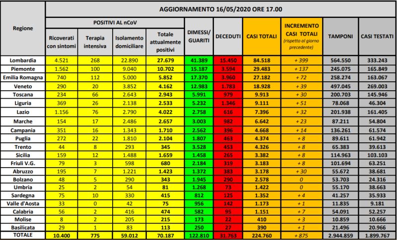 Il numero dei ricoveri continua a ridursi, ma in misura minore rispetto alle 24 ore precedenti. Oggi sono 10.400 le persone ricoverate con sintomi, con un decremento di 392 pazienti rispetto a ieri quando si era registrata una riduzione di 661. Prosegue comunque il calo della pressione sulle strutture ospedaliere. Il numero complessivo dei dimessi e guariti continua a salire, raggiungendo quota 122.810, con un incremento di 2.605 persone rispetto a ieri.