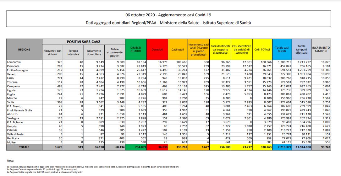 ROMA (ITALPRESS) – Risalgono i contagi di Coronavirus in Italia. Nelle ultime 24 ore i nuovi positivi – secondo il bollettino diramato dal ministero della Salute – sono 2.667 (ieri erano stati 2.257). Ma rispetto a ieri sono molti di più i tamponi: ben 99.742 contro i 60.241 del giorno precedente. In crescita pure il numero dei decessi: 28 (12 in più rispetto a ieri). Il totale dei dimessi/guariti è di 234.099 (+1418), mentre gli attuali positivi sono 60.134 (+1.231). Ad oggi sono 3.625 (+138) i ricoverati con sintomi, 319(-4) si trovano in terapia intensiva, mentre in isolamento domiciliare ci sono 56.190 persone. Le regioni con il maggior numero di nuovi casi sono Campania (495), Lombardia (350), Lazio (275) e Veneto (250). Quelle con gli incrementi minori sono Molise (6), Valle d’Aosta (5), Basilicata (4).